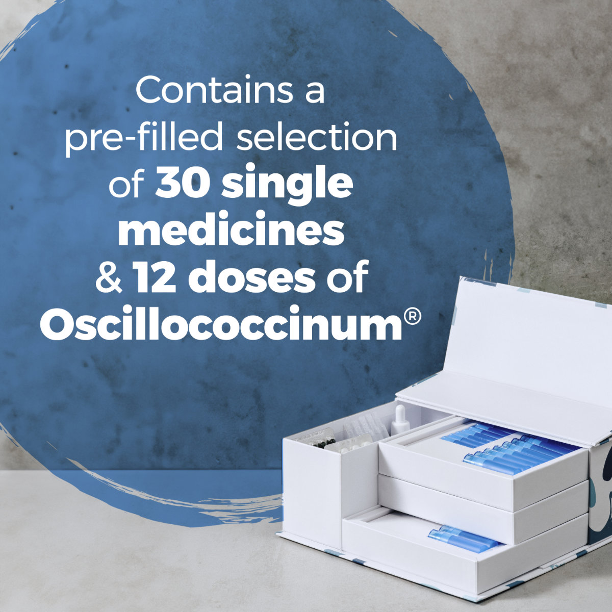The Eco HomeoFamily Kit is a versatile home solution from Boiron, world leader in homeopathic medicines.. Featuring an elegant design and magnetic closure, this kit is crafted with earth-friendly and recyclable materials like cardboard and paper. Filled with our pharmacists’ selection of widely used homeopathic medicines, it is designed to keep you organized and prepared to address a range of common conditions, including allergies, coughs, colds, flu, stress symptoms, muscle pain, insect bites, motion sickness, heartburn, and more. The thoughtfully designed interior of the Eco HomeoFamily Kit includes three trays filled with 30 Boiron single medicines, plus 12 doses of Oscillococcinum®. Additionally, a large capacity drawer provides space for other essentials, making it the ideal storage solution for newcomers to homeopathy and experienced users alike.